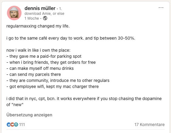 ich wäre gerne irgendwo Stammkunde. Jemand, der in ein Café kommt, die Namen der dort Arbeitenden kennt, wiedererkannt wird und entsprechend Teil einer kleinen Community ist, die sich um diesen Dritten Ort herum entwickelt. Netter Smalltalk, in Kontakt mit anderen Stammkunden kommen, sich in seiner Nachbarschaft zu Hause fühlen.